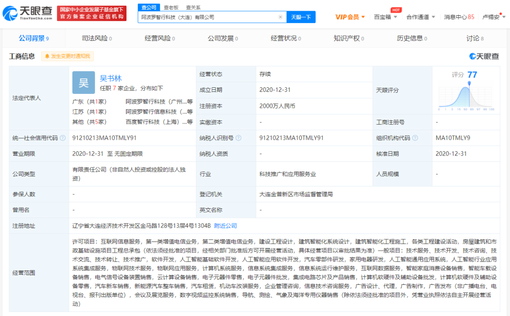 据天眼查APP显示,近日,阿波罗智行科技(大连)有限公司成立,注册资本2000万元人民币,法定代表人为吴书林,经营范围包含人工智能基础软件开发,人工智能应用软件开发,汽车零部件研发,家用电器研发,物联网技术服务,汽车新车销售等。
