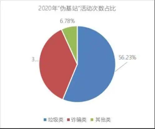 通过利用“大数据+互联网”技术,进一步提升了监测定位查找“伪基站”的能力,打击效率大幅提升。“伪基站”实时监控平台监测显示,全年“伪基站”总活动次数546次,相比2019年1万余次的活动次数,同比下降94.68%。其中垃圾类“伪基站”活动次数占比56.23%,诈骗类“伪基站”活动次数占比37%,其他类“伪基站”活动次数占比6.78%。