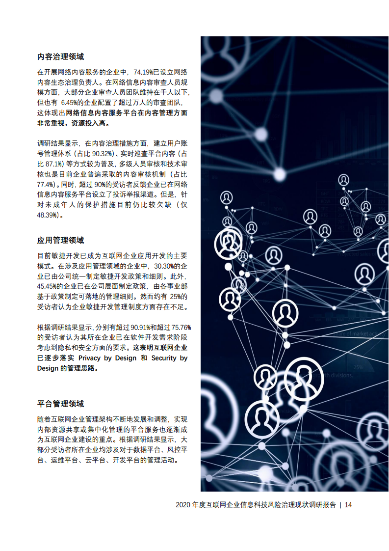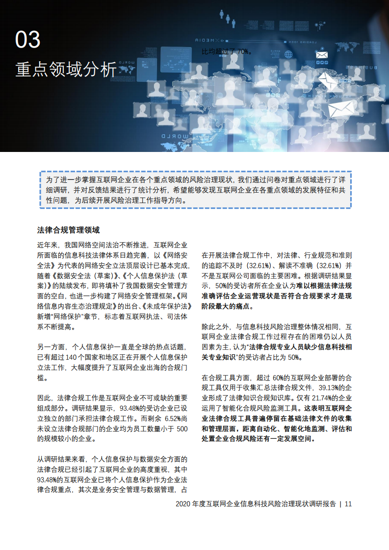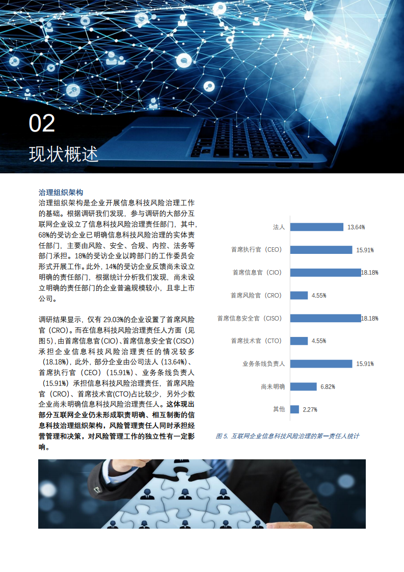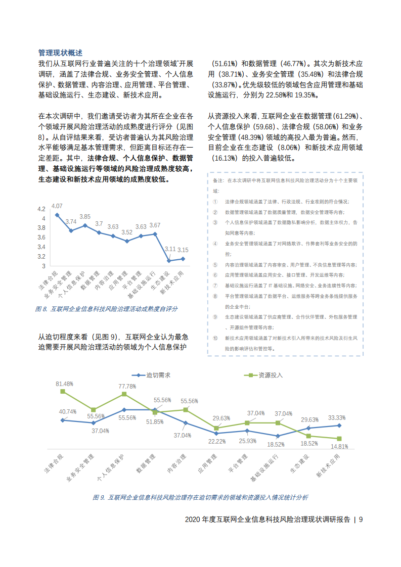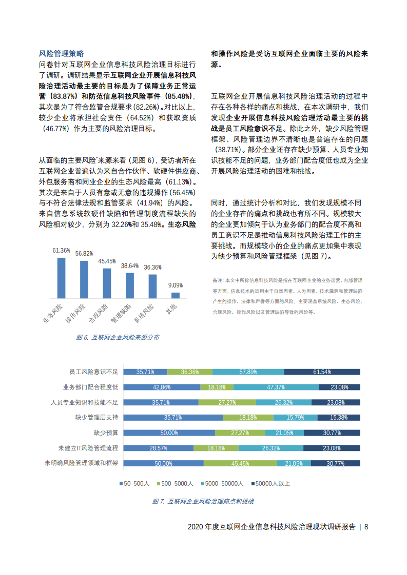 从本次调研情况来看,互联网企业普遍已经在法律合规、业务安全管理、个人信息保护、数据管理、内容治理、应用管理、平台管理、基础设施运行、新技术应用等领域开展了信息科技风险治理活动。同时,调研也总结出互联网企业在开展信息科技风险治理活动的过程中存在若干具有行业共性的发展特征和关键挑战。例如,在治理架构方面,部分互联网企业尚未建立起权、责、利对等的治理组织架构,科技风险管理缺少独立性和管理层支持,使得工作推进存在重重困难;在风险来源方面,生态风险和操作风险已超过系统风险和管理缺陷,成为互联网企业面临的主要风险来源;在监管环境和标准规范方面,受访者普遍反馈在生态建设,以及人工智能、区块链、大数据等新技术应用领域较为空缺,缺少相关指引和规范。因此,可能导致互联网企业难以有效地实施可落地的风险治理措施防范行业生态和新技术带来的新风险。