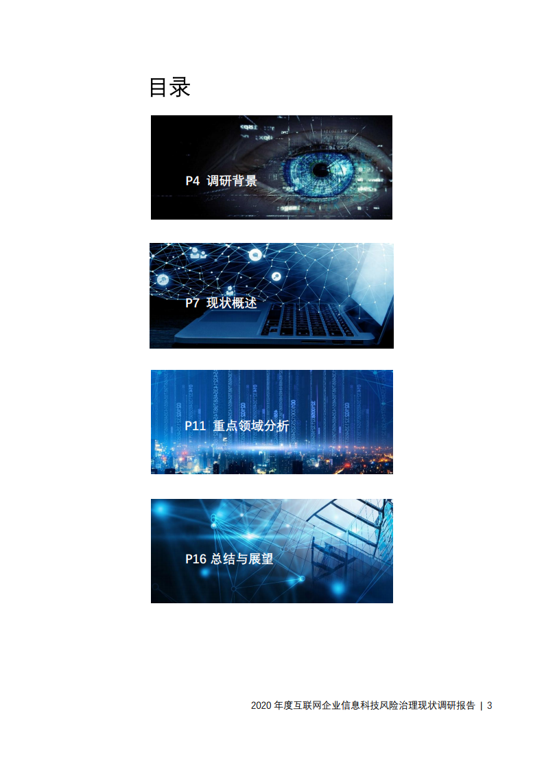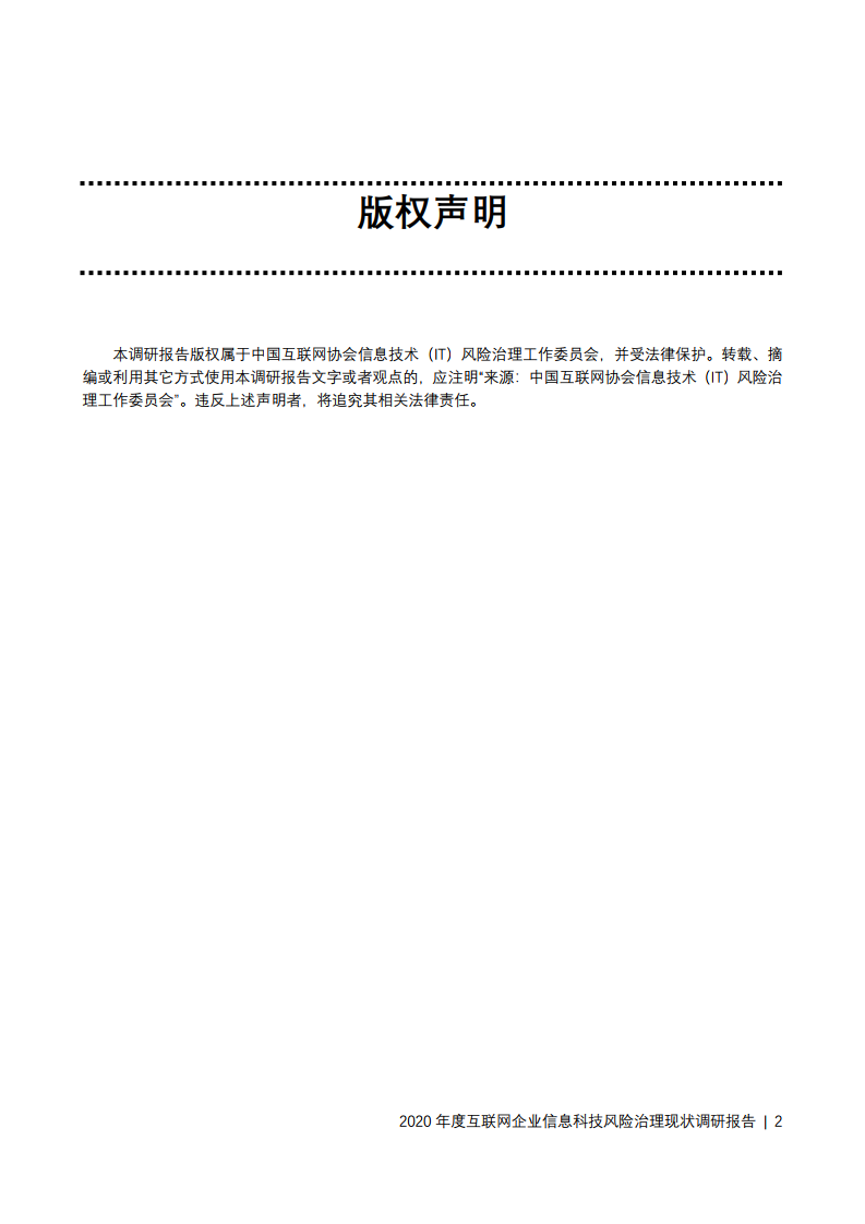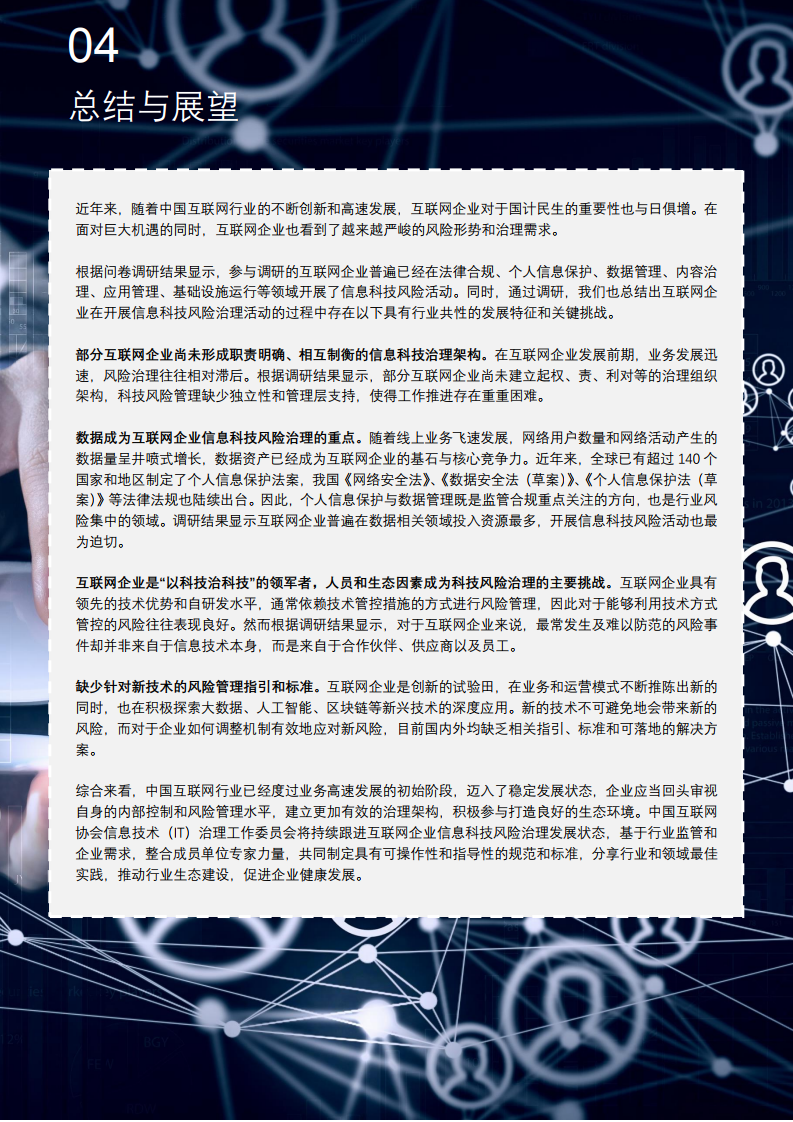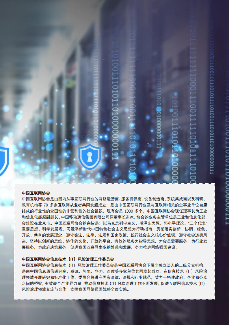 报告对目前互联网企业信息科技风险治理组织架构、风险管理策略、管理现状进行现状分析,对信息科技风险治理重点领域进行了详细调研,并对中国互联网企业信息科技风险治理情况进行了总结与展望。希望通过本次调研为后续开展风险治理工作提供指导方向。