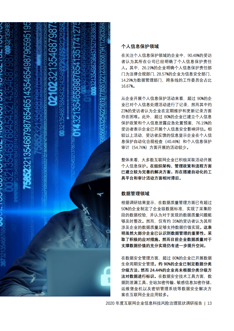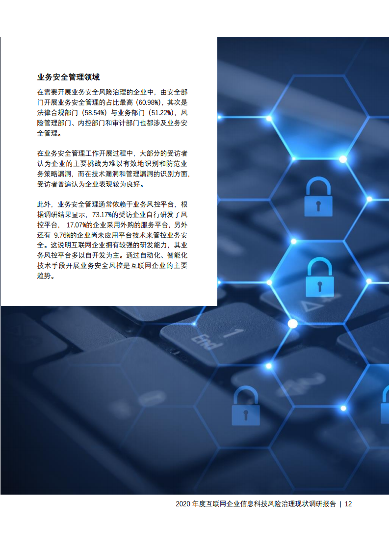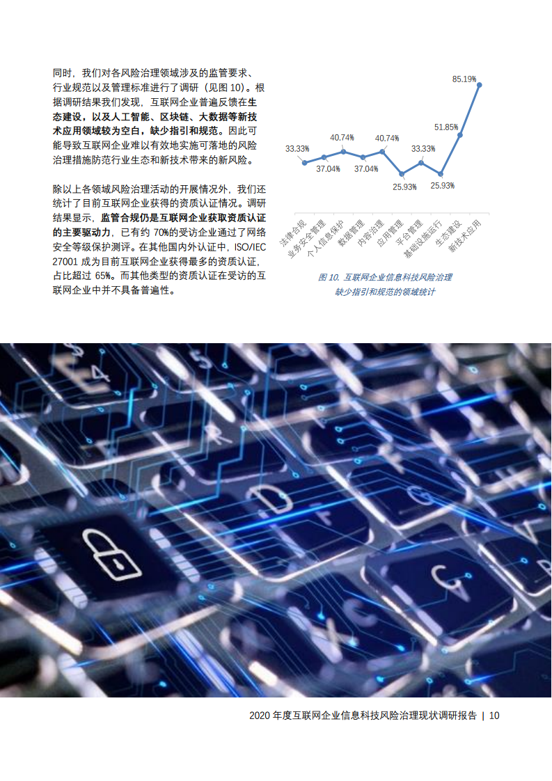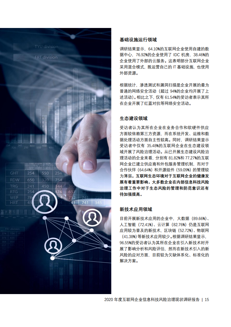 报告对目前互联网企业信息科技风险治理组织架构、风险管理策略、管理现状进行现状分析,对信息科技风险治理重点领域进行了详细调研,并对中国互联网企业信息科技风险治理情况进行了总结与展望。希望通过本次调研为后续开展风险治理工作提供指导方向。