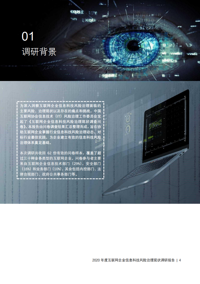 为深入洞察互联网企业信息科技风险治理面临的主要风险、治理现状以及存在的痛点和挑战,工作委员会发起了《互联网企业信息科技风险治理现状调查问卷》。本调研报告根据问卷调查结果汇总整理而成,旨在协助互联网企业掌握行业信息科技风险治理动态,对标行业最佳实践,为企业建立有效的信息科技风险治理体系奠定基础。