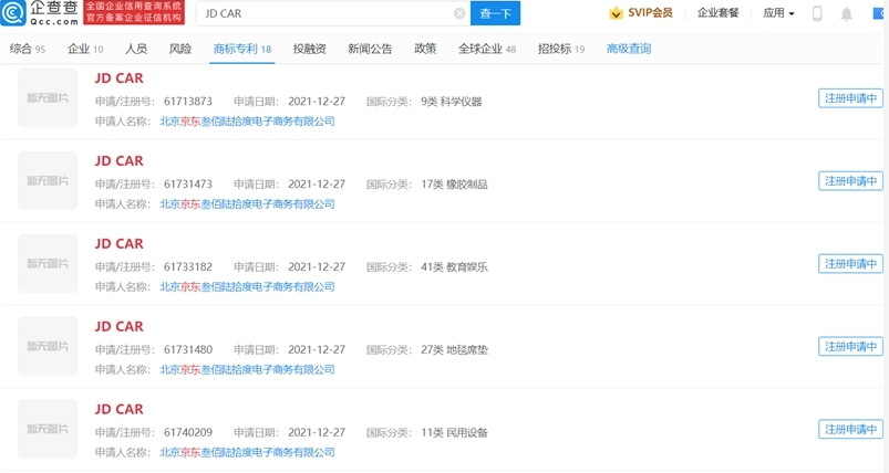 企查查APP显示,近日,北京京东叁佰陆拾度电子商务有限公司申请注册多个“JDCAR”商标,国际分类涉及机械设备、科学仪器、运输工具等,当前商标状态均为注册申请中。