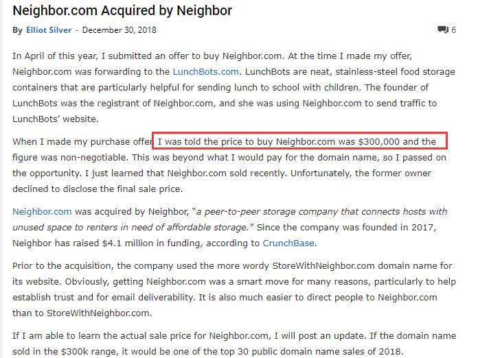据Elliot Silver称,今年4月份他曾向原持有者提出收购请求。不过,当时域名Neighbor.com正被持有人启用,跳转到了其名下创立的网站LunchBots.com。虽然持有者也有出售意向,但高达30万的美金(约合人民币206万元)的要价,而且不容谈判议价,最终让Elliot Silver望而却步。