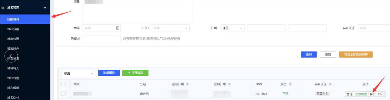 1.在域名管理——我的域名中,找到需要添加解析的域名。点击“解析”进入域名解析界面