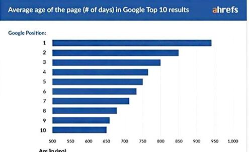 ahrefs统计了2百万随机关键词的前10个页面,可以看到,排在前10的页面平均是2年以上的页面,越靠前越老,排在第一页的平均存在了将近3年。排在前10的页面,有将近60%是3年以上的老页面,不到20%是2年的页面,只有22%是不到1年的页面。