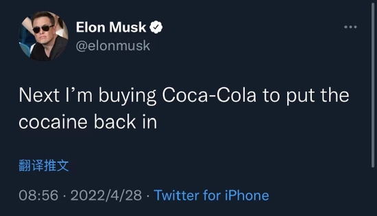 4月28日消息,继宣布收购社交平台Twitter后,特斯拉CEO埃隆·马斯克(Elon Musk)疑似锁定了“新目标”——美国消费品巨头可口可乐公司。马斯克今日发推文称,“接下来我要收购可口可乐公司,再把可卡因重新加进去。”