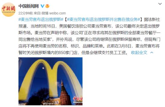 此前在3月8日,麦当劳宣布将暂时关闭俄罗斯境内的850家门店,但是会继续支付员工工资。