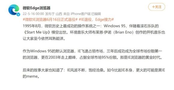 5月16日,微软Edge浏览器在微博正式公布称,微软IE浏览器将于6月16日正式退役,此后其功能将由Edge浏览器接棒。
