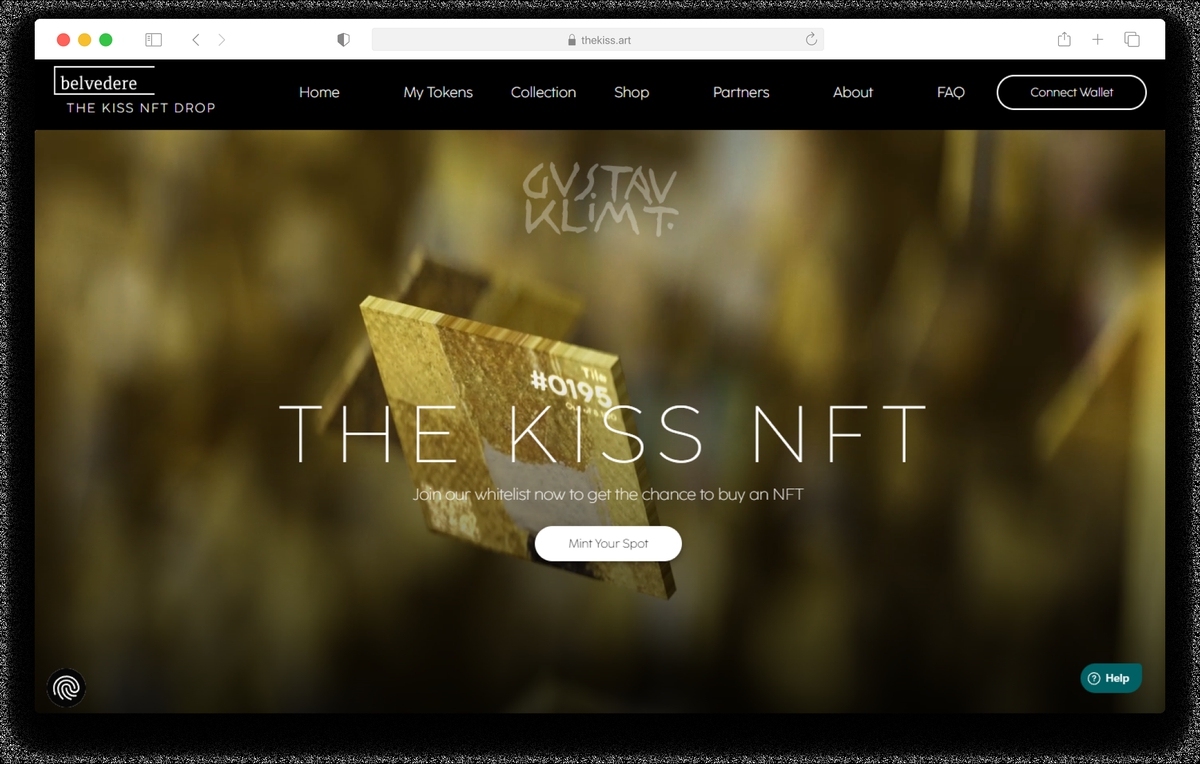 维也纳美景宫将古斯塔夫·克里姆特 (Gustav Klimt) 的画作《吻》(The Kiss) 转化为数量有限的 NFT,並且用网站thekiss.art展示这个数字爱情宣言。《吻》被认为是维也纳新艺术运动和欧洲现代主义的标志性作品,而美景宫收藏着世界上最多的克里姆特画作。美景宫与奥地利科技公司artèQ合作,将《吻》的高分辨率扫描副本切分成一万个方块,每一块都是图案独特的NFT ,购买者可以在平台上通过收藏的NFT寄语给心爱的人。