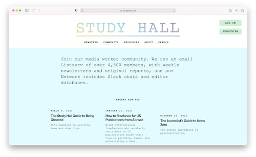 StudyHall.xyz是一个该类社群的例子,可以帮助你实现这个技巧。他们是面向媒体专业人士的独立媒体渠道和在线支持网络,是面向自由作家的在线社群,旨在促进媒体行业的社群发展和协作。成员可以通过平台的分享经验组进行交流和。StudyHall.xyz还向有抱负的记者发送会员摘要,其中包含对当前新闻和资源的评论。成员可以轻松地与社群的其他成员联系并与网站的所有功能进行交互。