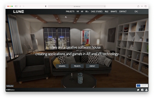 Lune.xyz是一家位于波兰的数字营销机构,帮助他们的用户将以上技术应用于网站。他们专注于使用交互式、尖端的AR和VR技术将消费者与产品联系起来。他们的用户可以通过交互式应用程序和游戏、金字塔全息可视化、交互式映射以及更多AR和VR工具来取悦网站访问者,以建立消费者的信任并推广他们的想法。当品牌的用户在网上购买椅子时,AR技术可以向他们展示椅子在客厅中的效果,只需将手机摄像头对准,就可以增加用户对购买的信心,并将失望的余地降至最低。