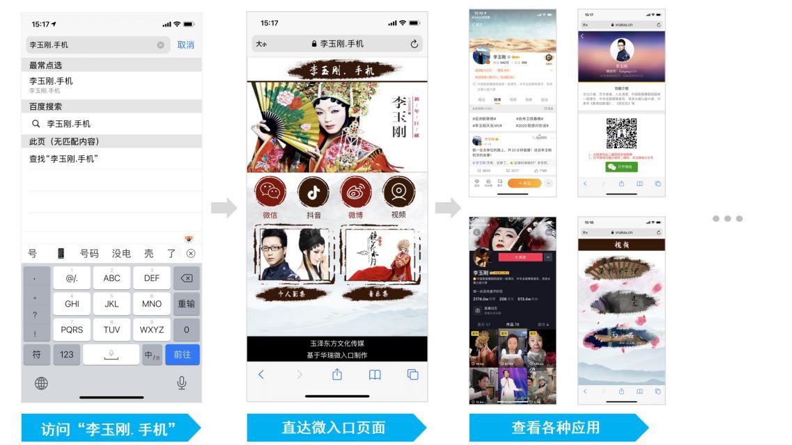 比如,中国歌剧舞剧院国家一级演员李玉刚就注册了“李玉刚.手机”域名,将自己的微信、抖音、微博等用应用入口统一到一个页面,样式新颖,功能强大,而且避免了粉丝因搜索结果不可控而找不到官方账号的尴尬。