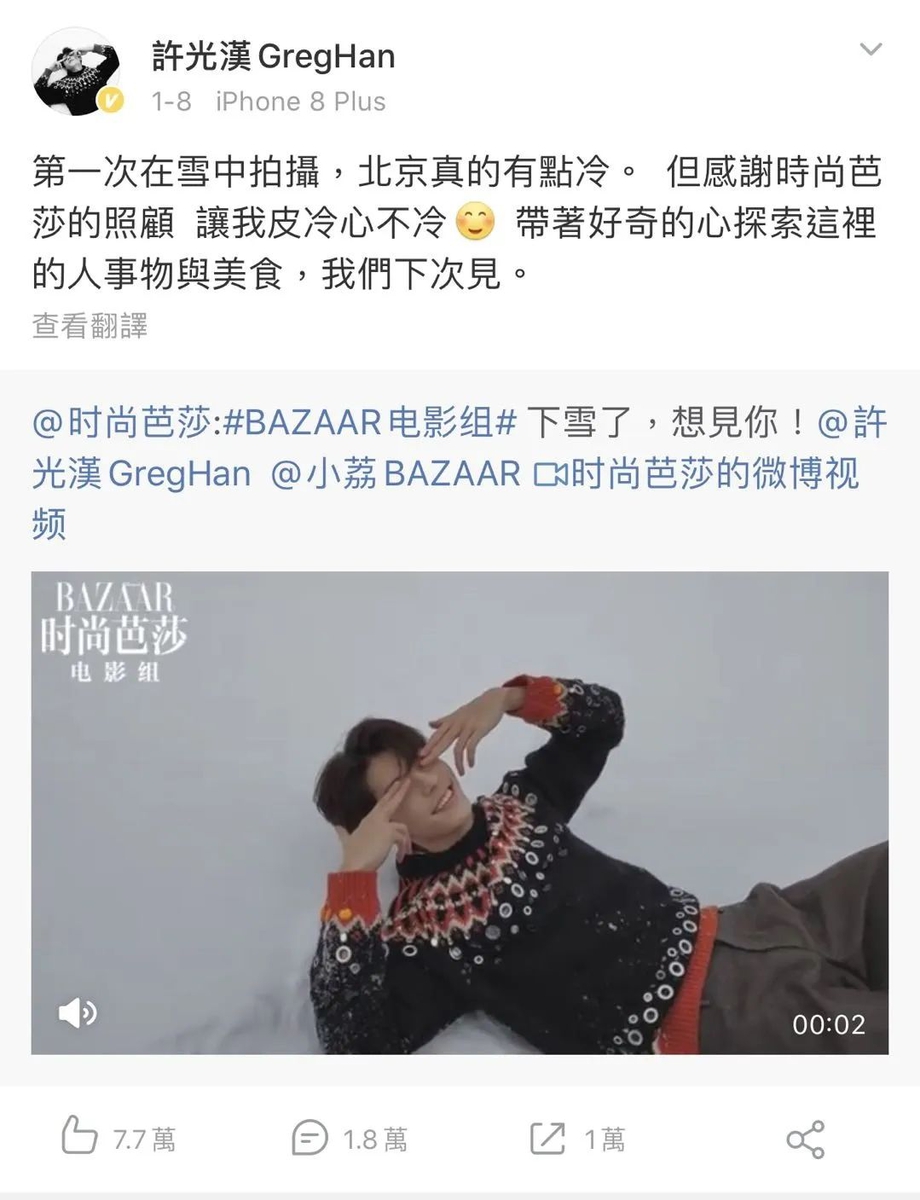 《想见你》在内地播出一个月后,《时尚芭莎》就率先嗅到了商机,为许光汉拍摄了一组“雪地”动态图。要知道之前能享受此待遇的是之前因《陈情令》大火的肖战、王一博……许光汉本人微博转发了《时尚芭莎》的相关拍摄微博,随后微博转发量迅速破万,成为了《想见你》播出之后许光汉首个人气超高的微博。